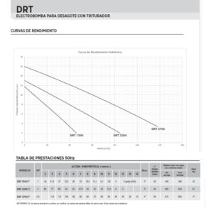 La línea de electrobombas sumergibles portátiles trituradoras para desagote “DRT 1500 / 2200 / 3700”, brinda una óptima prestación hidráulica en el bombeo de aguas sucias o cargadas con sólidos en suspensión y fibras largas debido a su sistema de cortador axial. Es apta para el bombeo en sumideros, desagües pluviales y cloacales, hospitales y clínicas, sótanos, etc, sumergiéndola directamente en el lugar a desagotar.