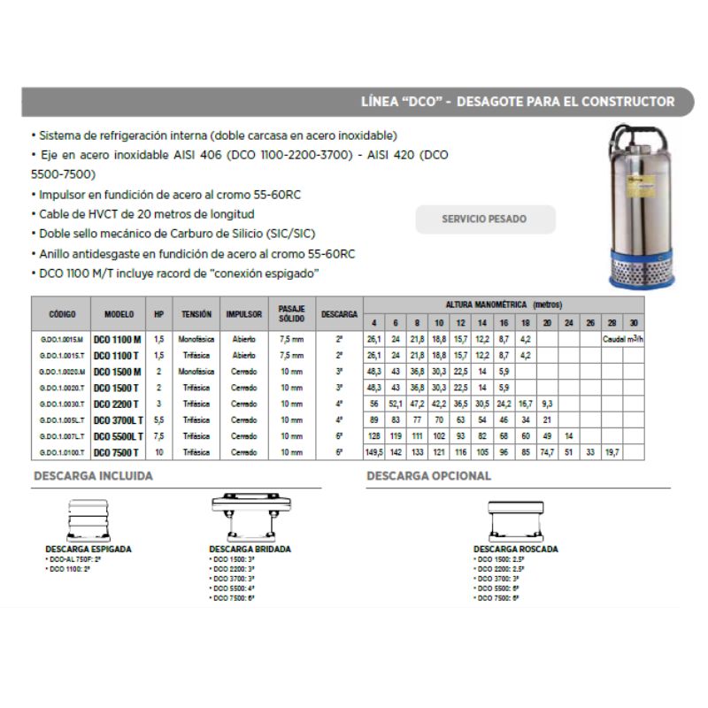 Las Electrobombas para Desagote “DCO” brindan una óptima prestación hidráulica en el bombeo de aguas sucias o cargadas con sólidos en suspensión. Son aptas para el bombeo en obras civiles, movimiento de líquidos, alcantarillado, bocas de tormenta, sumideros, etc, sumergiéndola directamente en el lugar a desagotar.