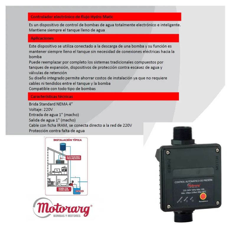 Ir al contenidoHydromatic es un dispositivo de control de bombas totalmente electrónico e inteligente. Mantiene siempre lleno el tanque de agua. Su diseño integrado permite ahorrar costos de instalación ya que no