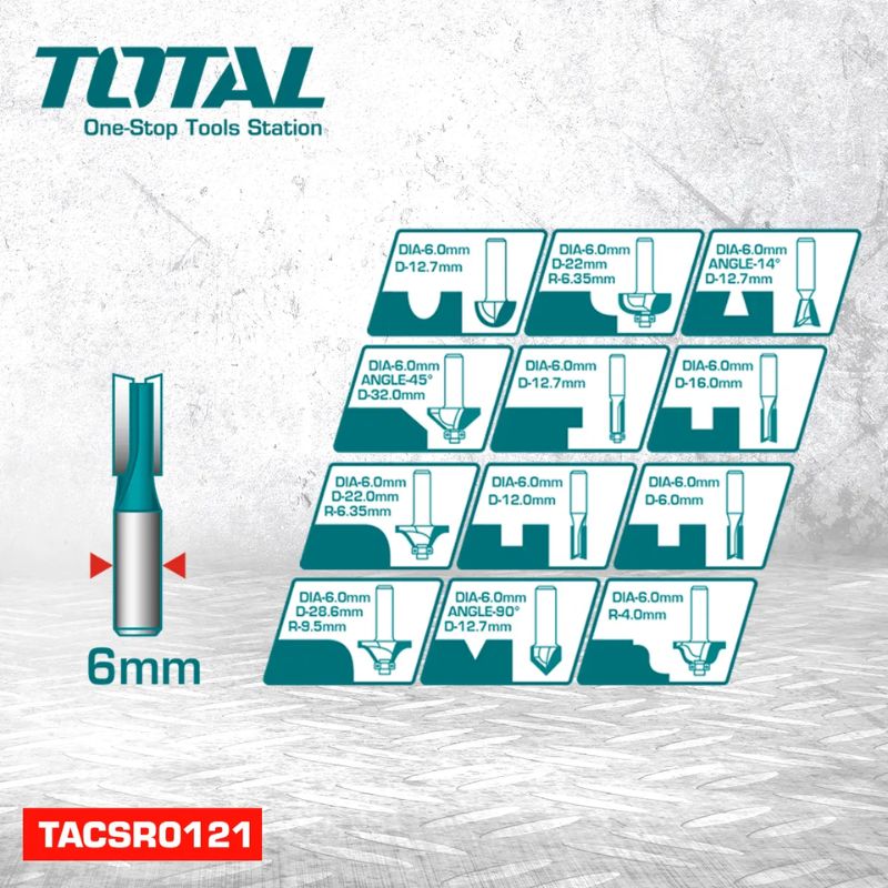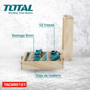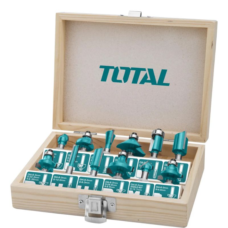 Los sets de fresas Total proporcionan cortes precisos para una amplia gama de aplicaciones en trabajos de madera, permitiendo la creación de diversos perfiles. Incluyen un estuche para su almacenamiento seguro
