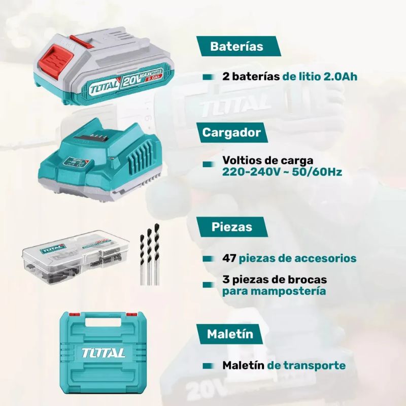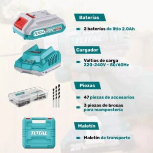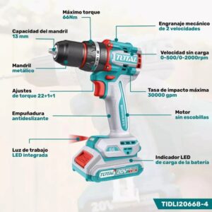 Taladro Inalambrico Brushless 20v 2000rpm 66nm TDLI20668-4 TOTAL